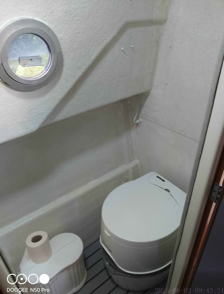 Electric flush toilet, hot and cold water, shower, galley, 12volt fridge, 240volt shore power.