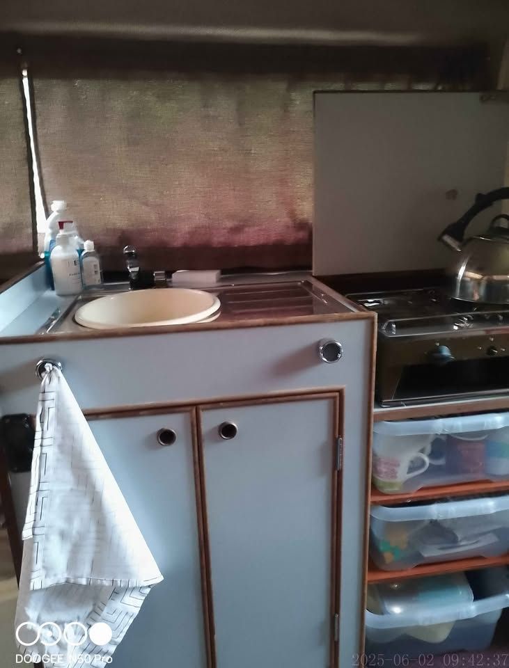 Galley Area with Hob and Grill, sale will include cutlery and plates etc. 2 Gas bottles. 2 x 25 litre Water Tanks.